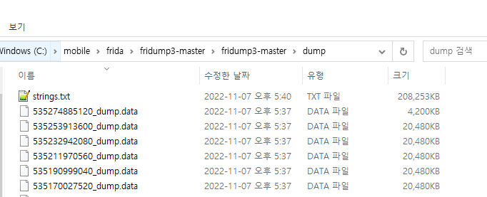 - 실행 후 dump 폴더가 생성되었을 것이며 string.txt 파일이 생성되었는지 확인