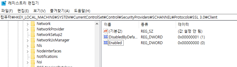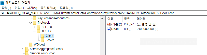 경로 : HKEY_LOCAL_MACHINE\SYSTEM\CurrentControlSet\Control\SecurityProviders\SCHANNEL\Protocols