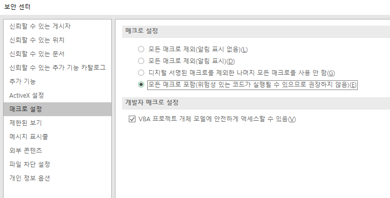 추가로 Excel 옵션 > 보안 센터 > 매크로 설정에서 모든 매크로 포함을 체크해야 매크로 사용이 가능하다.