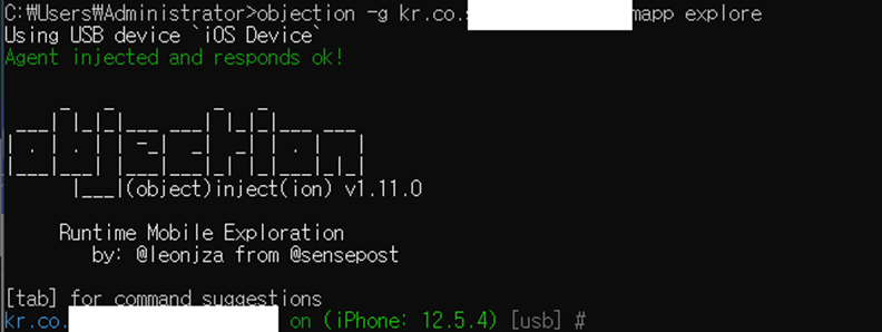 - 테스트 할 앱의 패키지명을 입력하여 objection 실행
